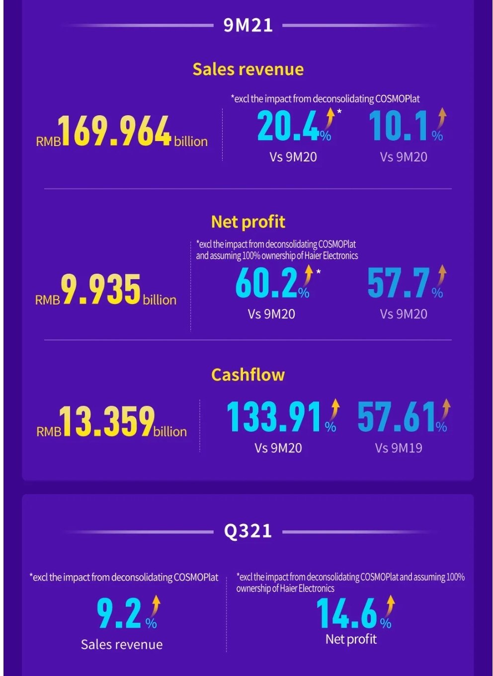 Haier Smart Home published 3Q21 results. From January to September, the Company realized double-digit revenue growth and even faster profit expansion, with continued cost optimization as well as doubled cashflow.