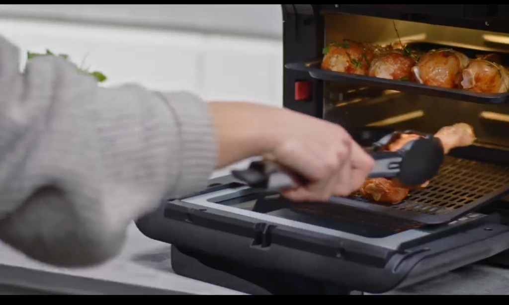 – Non-stick and dishwasher safe accessories including rotisserie fork, rotating basket, 8 piece skewer set, grill racks and drip tray