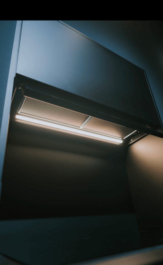 ✔️ A new built-in extractor hood with an elegant glass panel – virtually invisible when not in use. When cooking, the panel folds forward to provide intuitive control and protect the cabinetry.