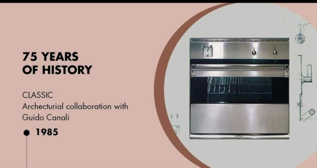 A truly innovative product for its era and one of the first gas cookers in the world with automatic ignition, safety valve and cooking programmer. A heritage Smeg triangular logo with a yellow background is also visible on the product.