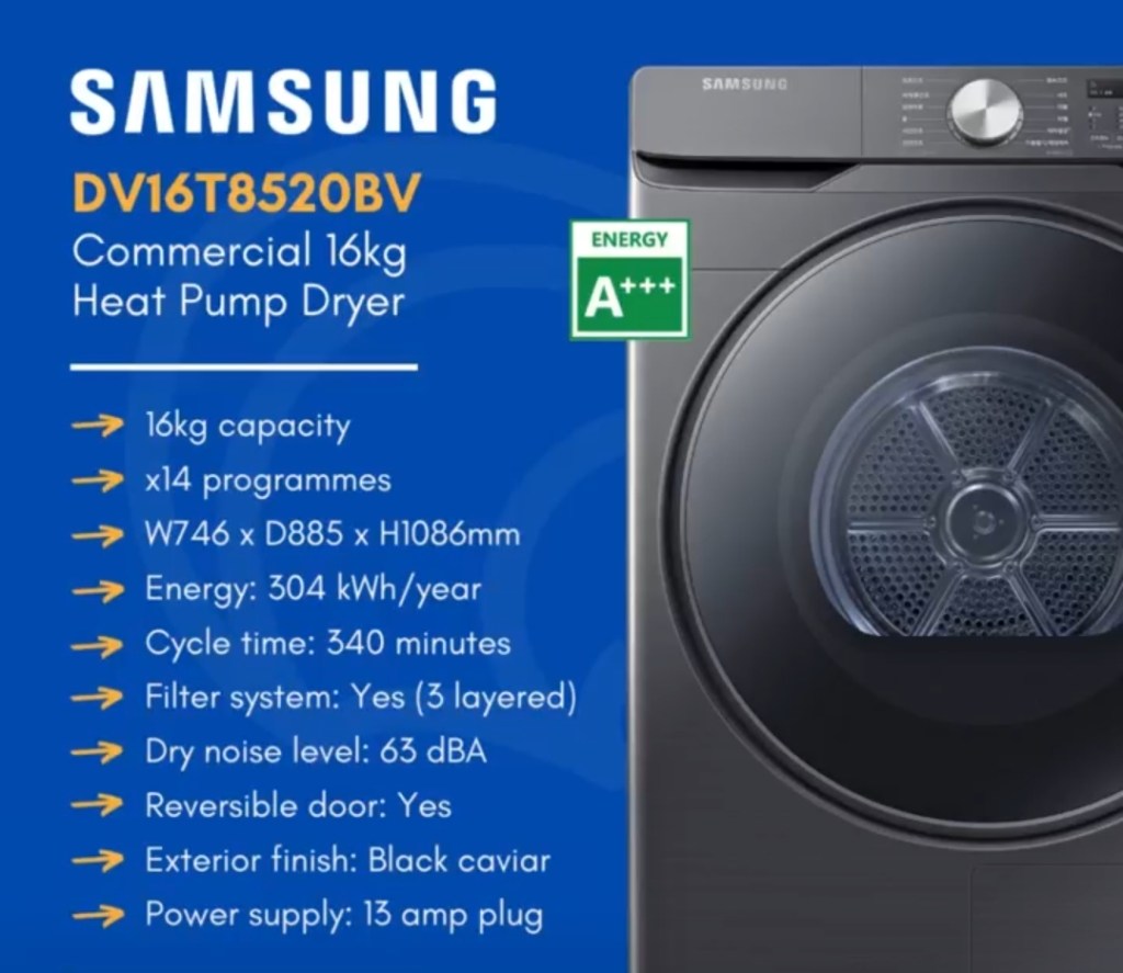 The equally stylish 𝗗𝗩𝟭𝟲𝗧𝟴𝟱𝟮𝟬𝗕𝗩 16kg dryer boasts a A+++ energy rating and comes included with Hygiene Care+ and delicates cycles. The 𝗗𝗩𝟭𝟲𝗧𝟴𝟱𝟮𝟬𝗕𝗩 also features Hybrid Heat Pump Technology: by reheating the air in the drum it’s gentler on even the most delicate of delicates. And it means you’ll use less electricity compare to a traditional condenser or vented tumble dryer.