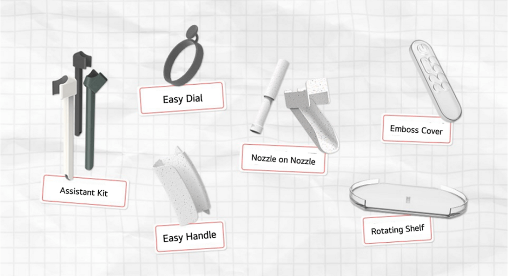 Winner of the Gold award , LG Comfort Kit, the set of accessories designed to improve the accessibility of LG appliances for all people, regardless of age, gender and ability. The Comfort Kit consists of seven accessories including the Easy Handle , the set of additional handles that allow users with limited manual strength or dexterity to easily open and close appliance doors; the Easy Ball , which allows the knobs of the appliances to be operated with the palm of the hand; and the Easy Hanger , the accessory with a circular handle that allows people with reduced mobility to easily place clothes inside the LG Styler smart wardrobe. These accessories, made of recycled plastic, are easy to attach and remove and perfectly fit the design of LG products.