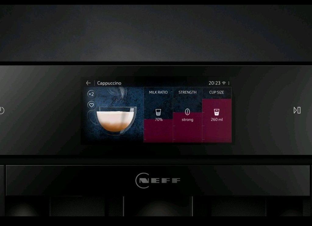 NEFF Home Appliances’s fully automatic coffee machines with “Flex Control” offer a large and high-performance touch display, providing an immersive experience that can be operated purely by touch or through a hybrid mode with the “Twist Pad Flex®” on either side. The intuitive “Tune Zone” on the display allows users to easily customize coffee-related choices, such as the desired amount or intensity, with a simple touch. As the user makes their selections, an animated cup on the display visually adjusts to reflect the chosen values, while a “Light Dialogue” provides color-based feedback for an even more engaging experience.