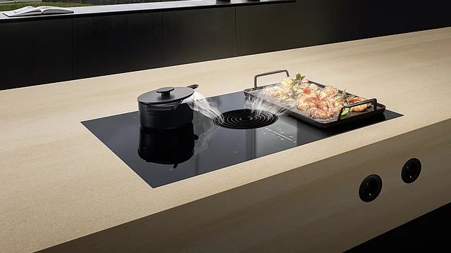 The new BORA M Pure is the most flexible of the compact cooktop extractor systems. Pots, pans and other cookware of all shapes and sizes fit perfectly onto the cooktops. Roasts for festive meals can be placed on the surface induction cooktop on the right while the left cooktop optimally detects small pans or even espresso makers thanks to the circular induction zones. The new BORA M Pure is a logical progression from our popular BORA Pure cooktop extractor system. It is a premium model that has been designed without compromise for the most flexible and enjoyable cooking experiences. The two surface induction cooking zones on the right can be connected together by the bridging function to create a large zone. This optimally heats large cookware, such is the BORA grill pan. If the roaster is sufficiently large and permanent pan size recognition is enabled, the zones are automatically combined. The two individual cooking zones on the left with zone induction are ideal for smaller pots, pans and espresso makers.