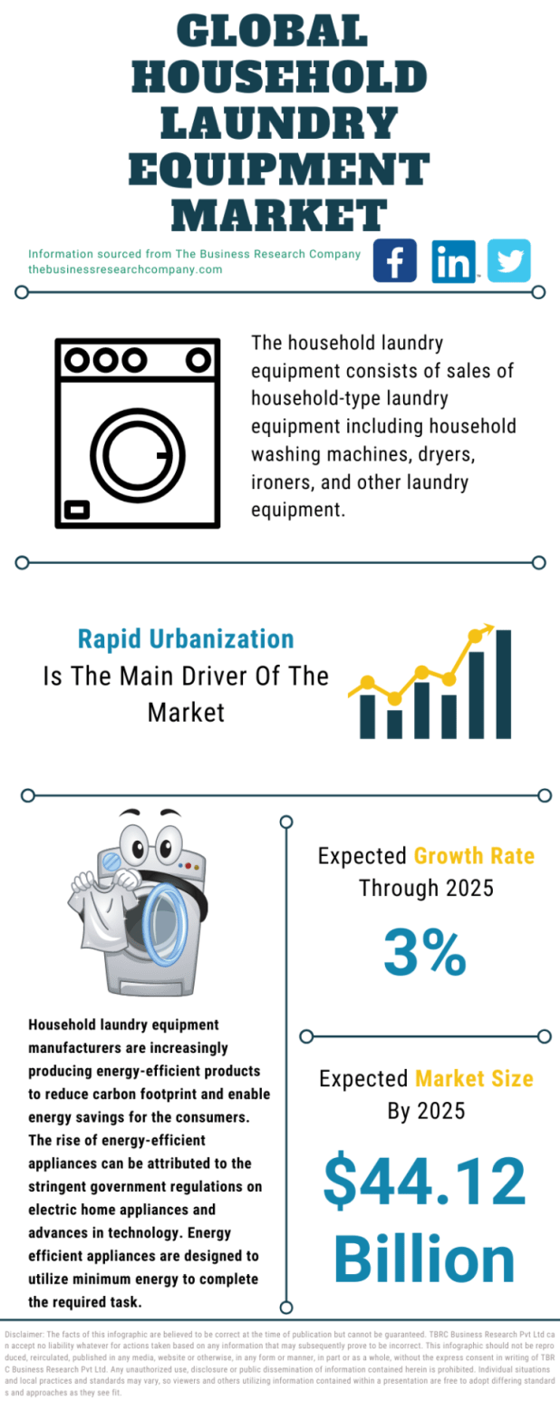 According to the Business Research company, the global household laundry equipment market size is expected to grow from $101.43 billion (€96.76bn) in 2021 to $110.84 billion (€105.74bn) in 2022 at a compound annual growth rate (CAGR) of 9.3%.